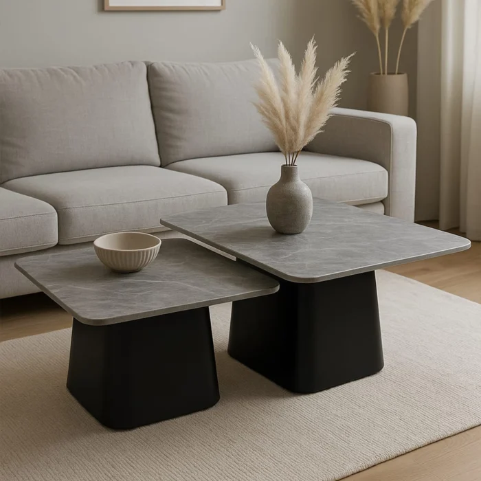 זוג שולחנות מרובע רגליים שחור מט ומשטח שיש לבן שחור
