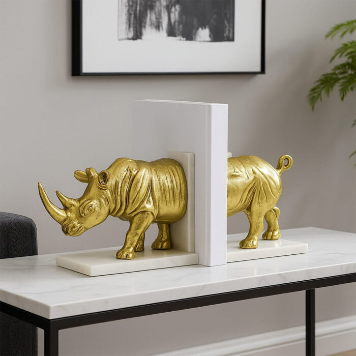 מחזיק ספרים דגם קרנף מאלומניום צבע זהב על בסיס שיש 44*13*20