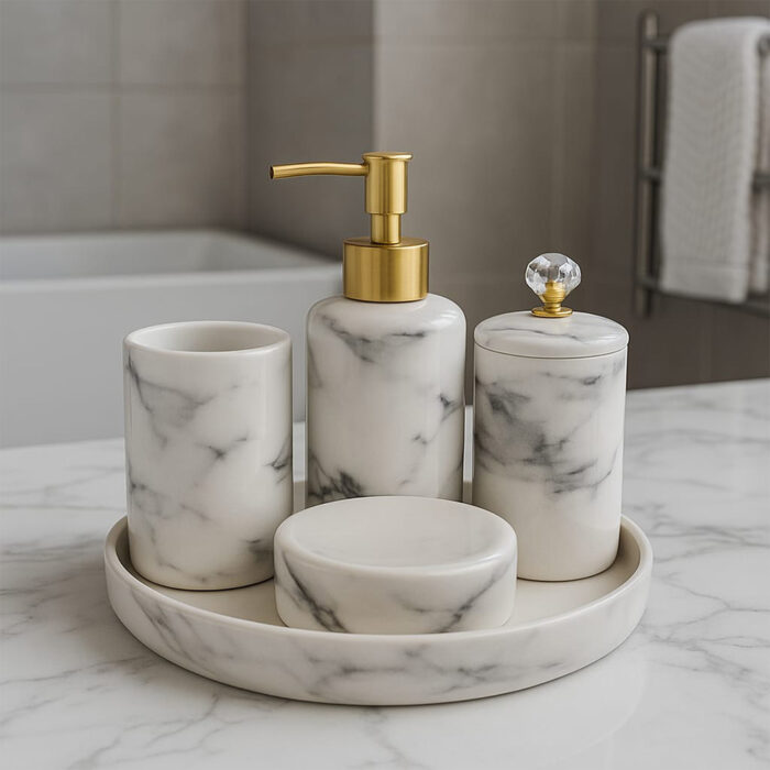 סט אמבטיה 1/5 צבע שיש לבן בשילוב זהב 116103 רב 6+*11+ 16*17 + 21 ס"מ