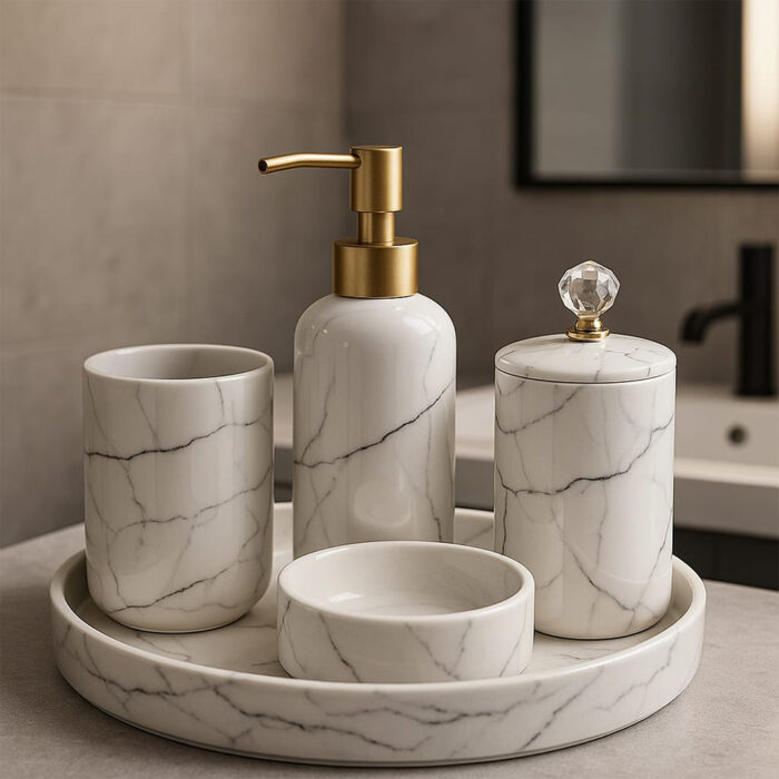 סט אמבטיה 1/5 צבע שיש לבן בשילוב זהב 3*10 6*11 6+*11 + 16*17 + 21 ס"מ