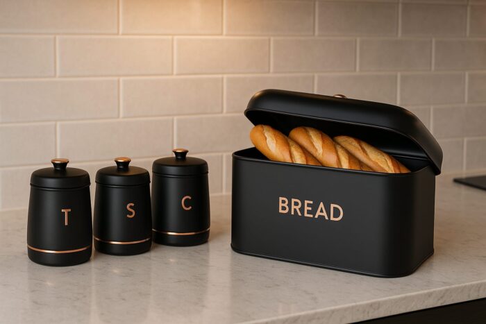 קופסת לחם עם 3 יחידות צנצנות קפה תה סוכר צבע שחור3*+19 35*23*18 בשילוב רוז גולד