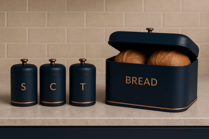 קופסת לחם עם 3 יחידות צנצנות קפה תה סוכר צבע אפורכהה בשילוב רוז גולד 18*23*35