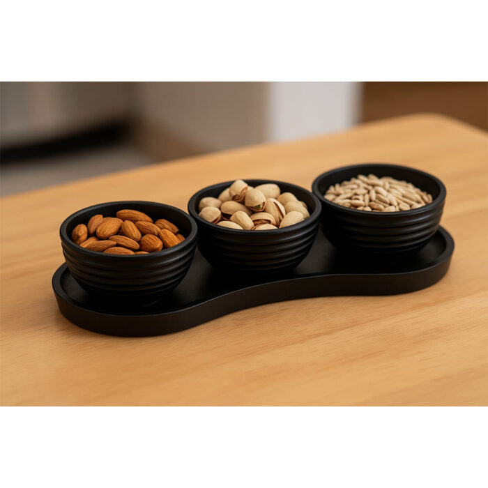 שלושה קערות הגשה מבראס שחור על מגש חצי אובלי 33.5*16.5*5.5